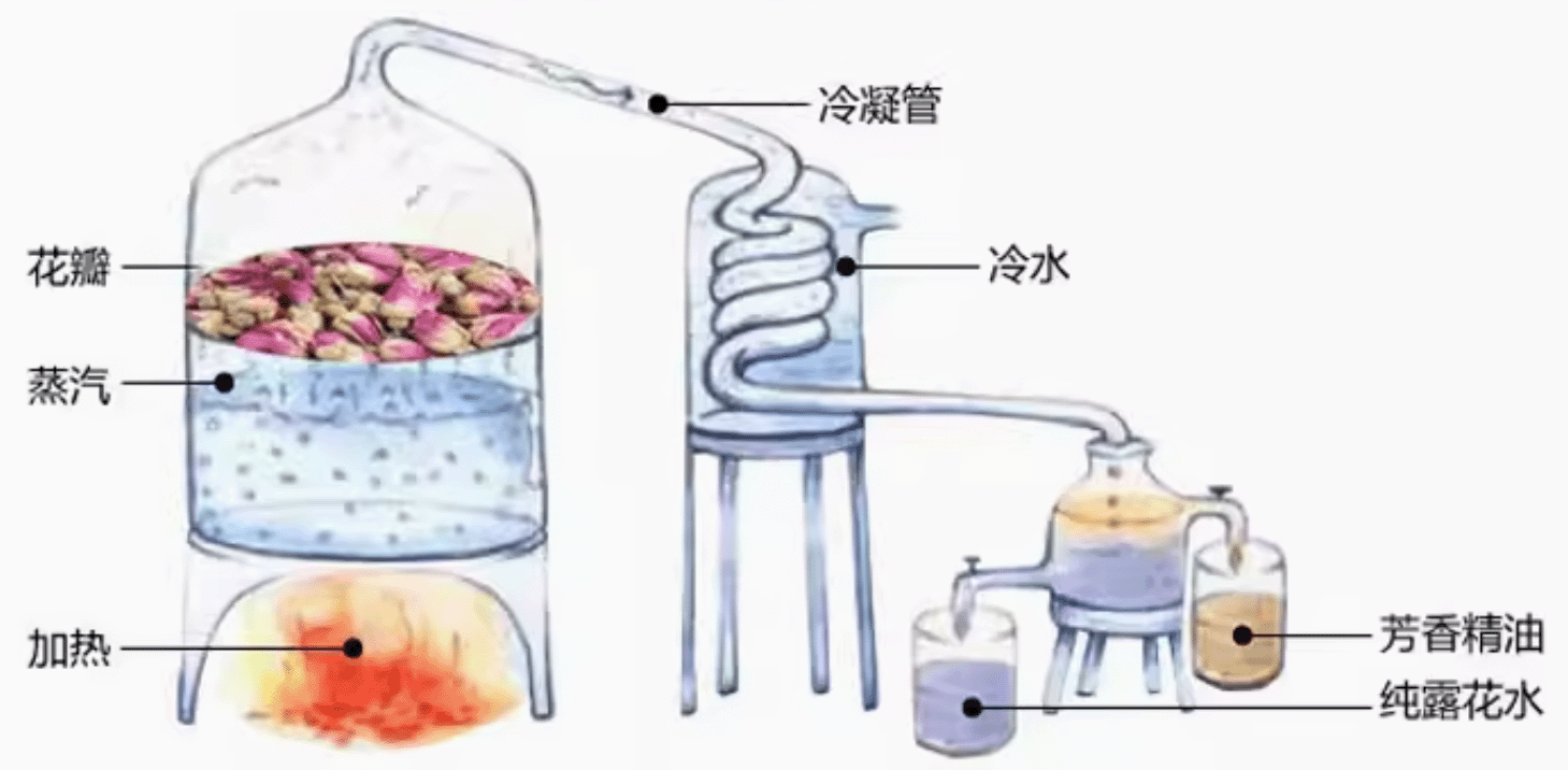 的不銹鋼蒸餾容器(蒸餾器),在容器底部加熱或通入蒸汽。當(dāng)炙熱的蒸氣充滿在容器里,會(huì)將植物內(nèi)存的芳香精油成分隨著水蒸氣蒸發(fā),并且隨著水蒸氣通過(guò)上方